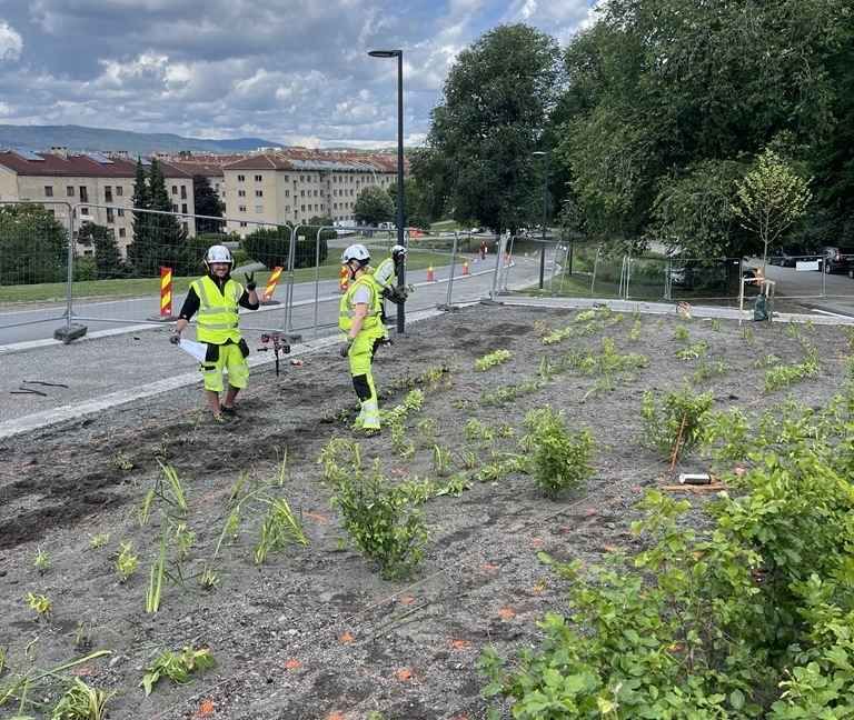 Arbeidere fra Akershusgatneren AS legger ut jord og planter ved Tøyenbadet.