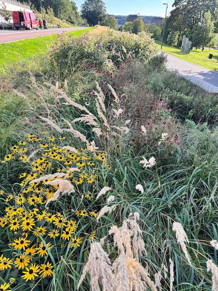 Frodig grøntområde med variasjon av gress - og staudevekster rundt Tøyenbadet.