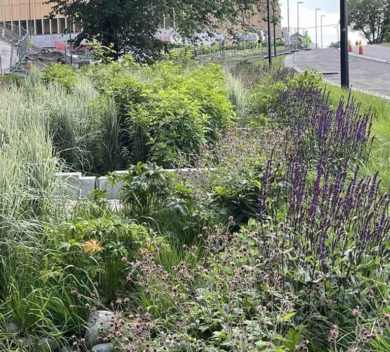 Frodig beplantning i regnbedet for å holde unna regnvann.